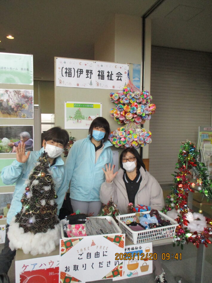 12月20日(土)、去年からすこやかセンターで開催されているクリスマスマーケットに伊野福祉会の代表としてぼっちり三人娘(?)が参加してきました。