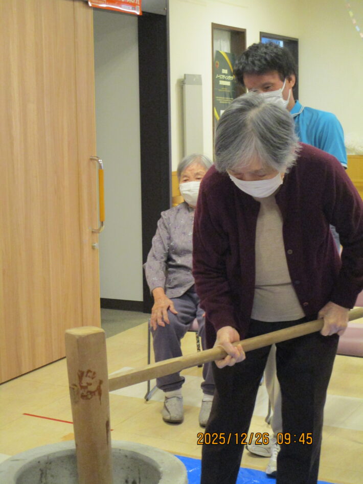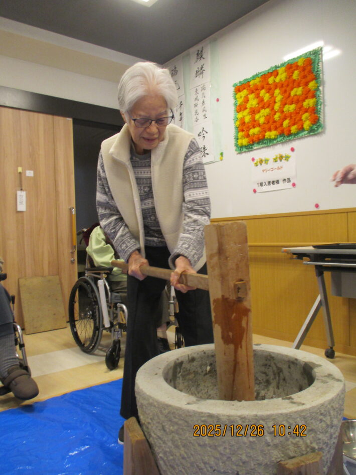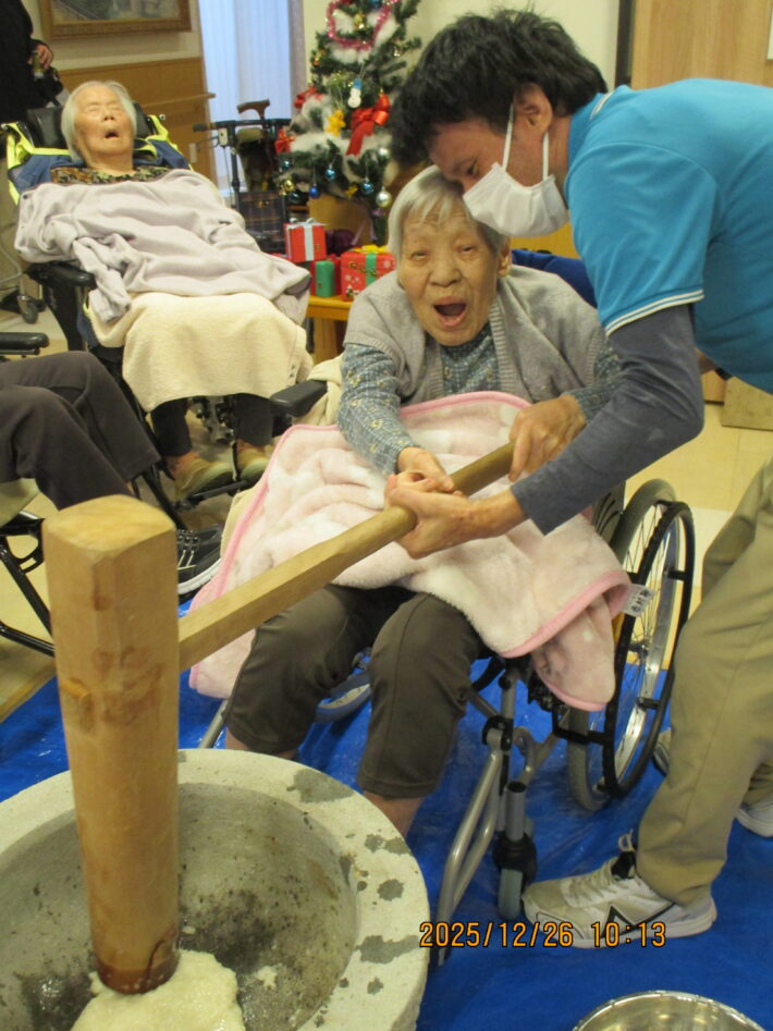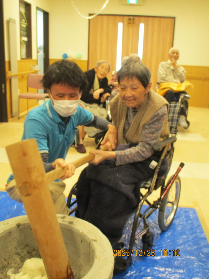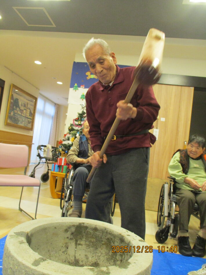 1階~3階の入居者様時間を分けて全員参加され一人一人餅を力いっぱい「よいしょおー」の掛け声と共に打たれて楽しまれていました!(^^)!