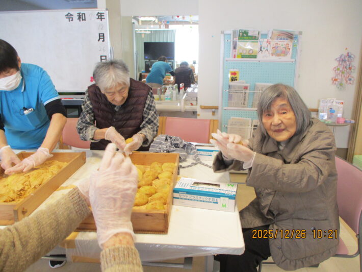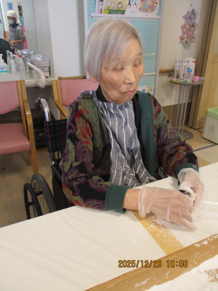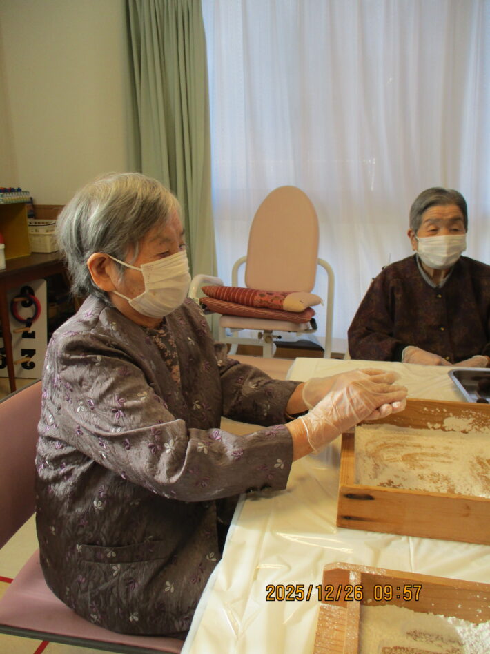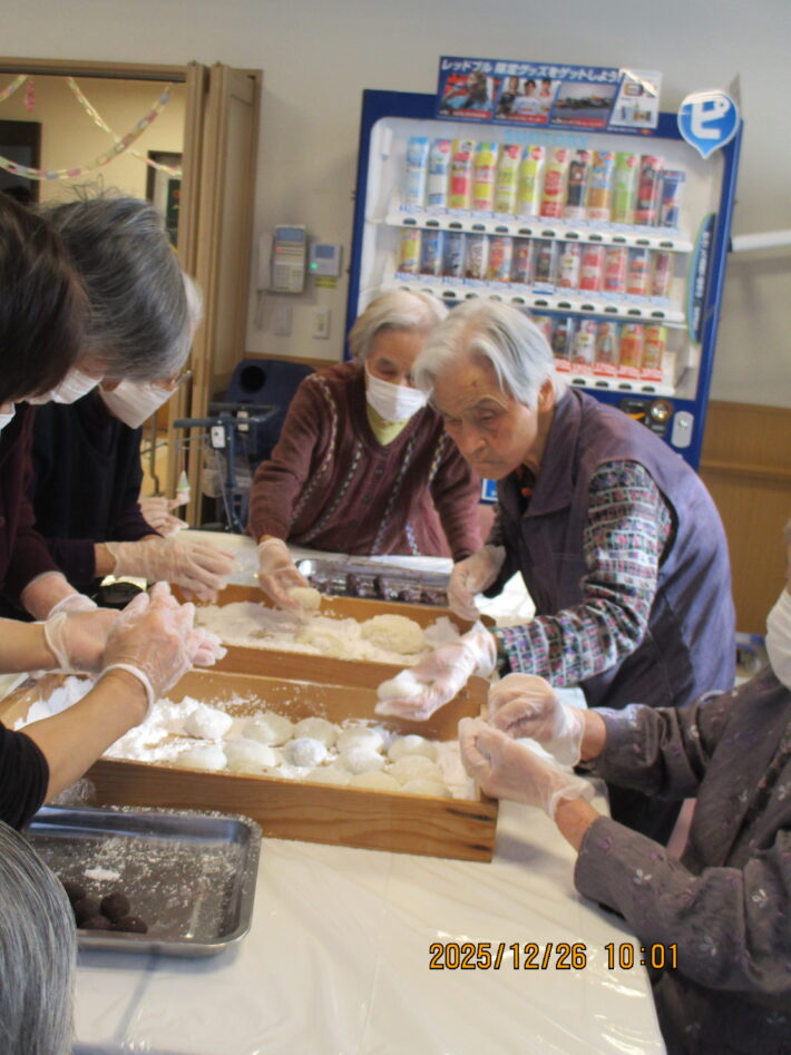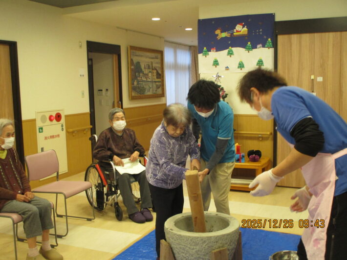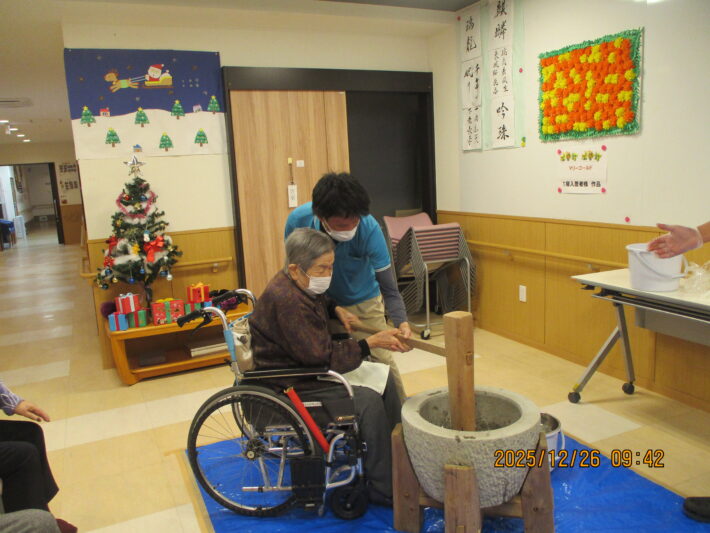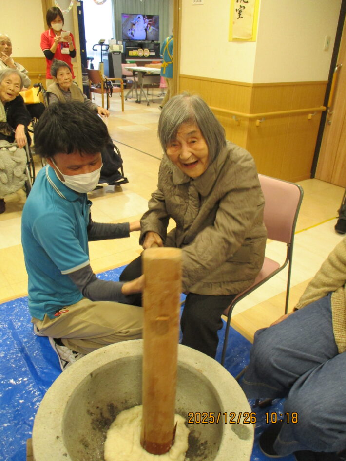 1階~3階の入居者様時間を分けて全員参加され一人一人餅を力いっぱい「よいしょおー」の掛け声と共に打たれて楽しまれていました!(^^)!