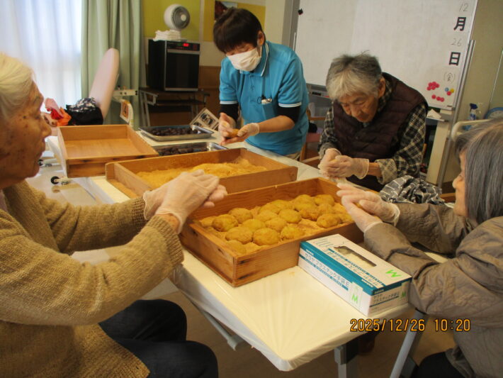 打ち立ての餅を小さく丸めて中に餡子を詰める手作業を談笑しながら取り組まれていました。