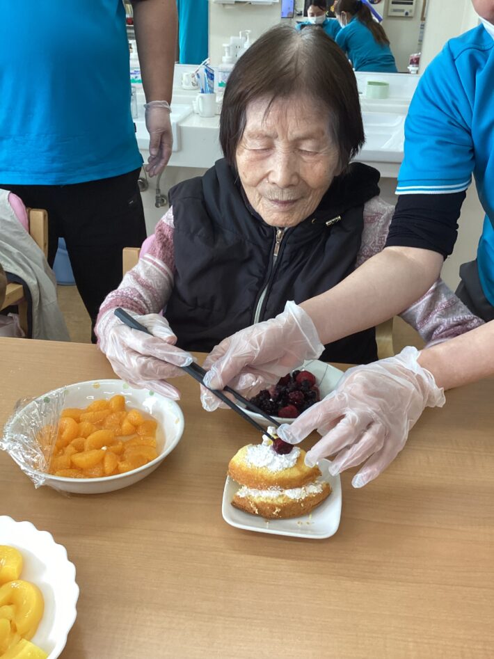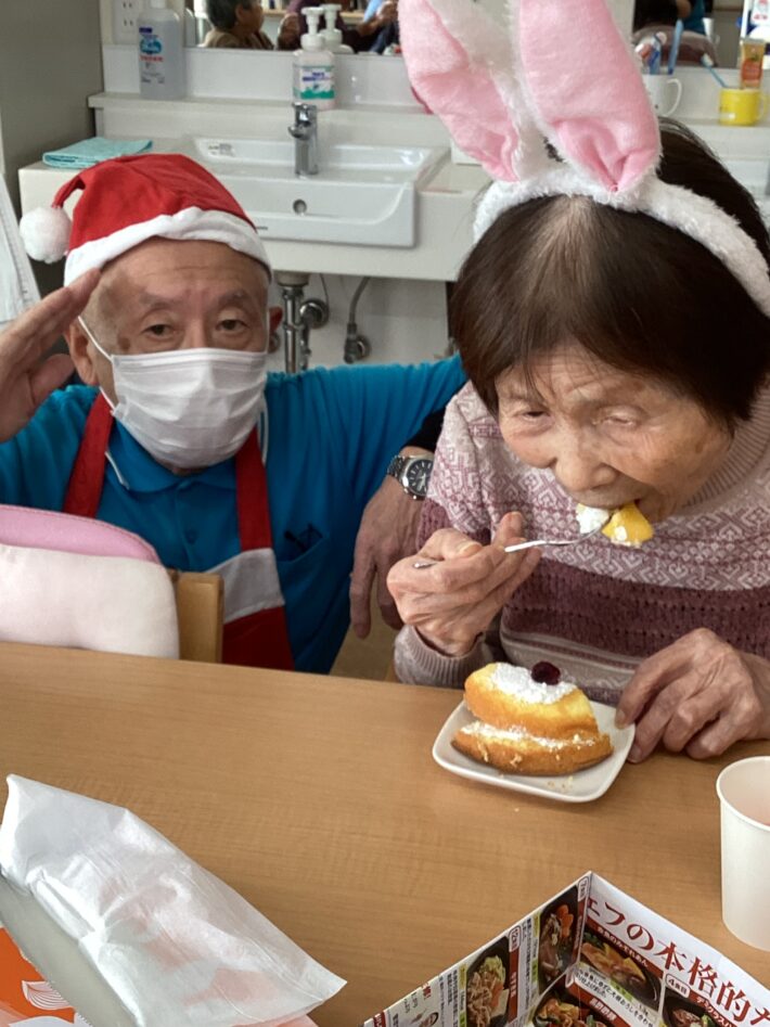 12月23日、クリスマス会を実施しました。午前中に一人一人、スポンジケーキにクリームとフルーツでデコレーションケーキを作りました。作ったケーキは、3時のおやつにおいしくいただきました。普段は小食な利用者さんも、自分で作ったケーキは大きな口で頬張ってあっという間に完食です。職員もトナカイやサンタの帽子とカチューシャでパーティーを彩ってくれました。